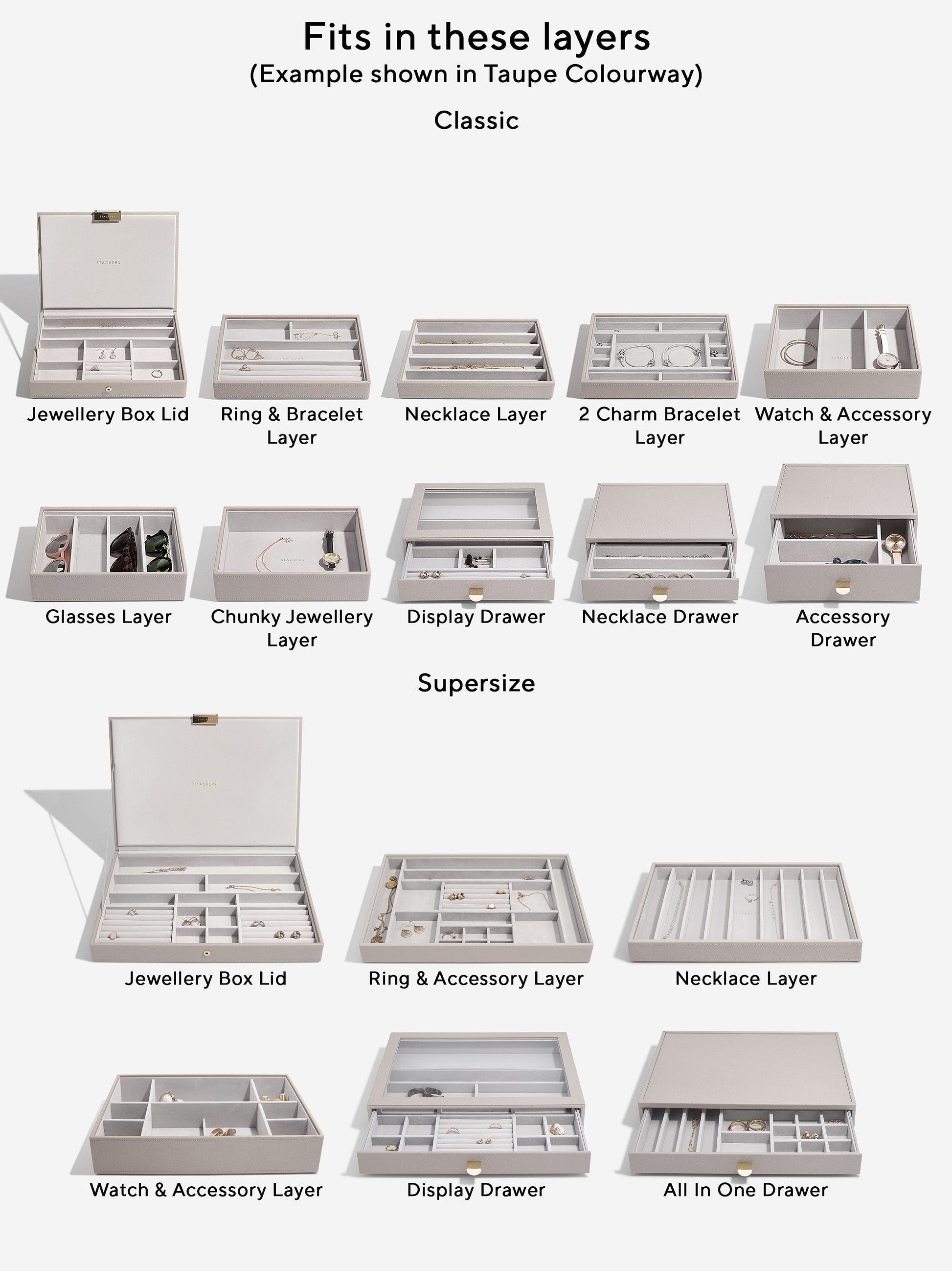 Designed to sit neatly in our Classic and Supersize Jewellery Box Lids, Classic Necklace Layer, 2 Charm Bracelet Layer & Supersize Ring/Bracelet Layer. They're a great way to make your jewellery box even more personal.
