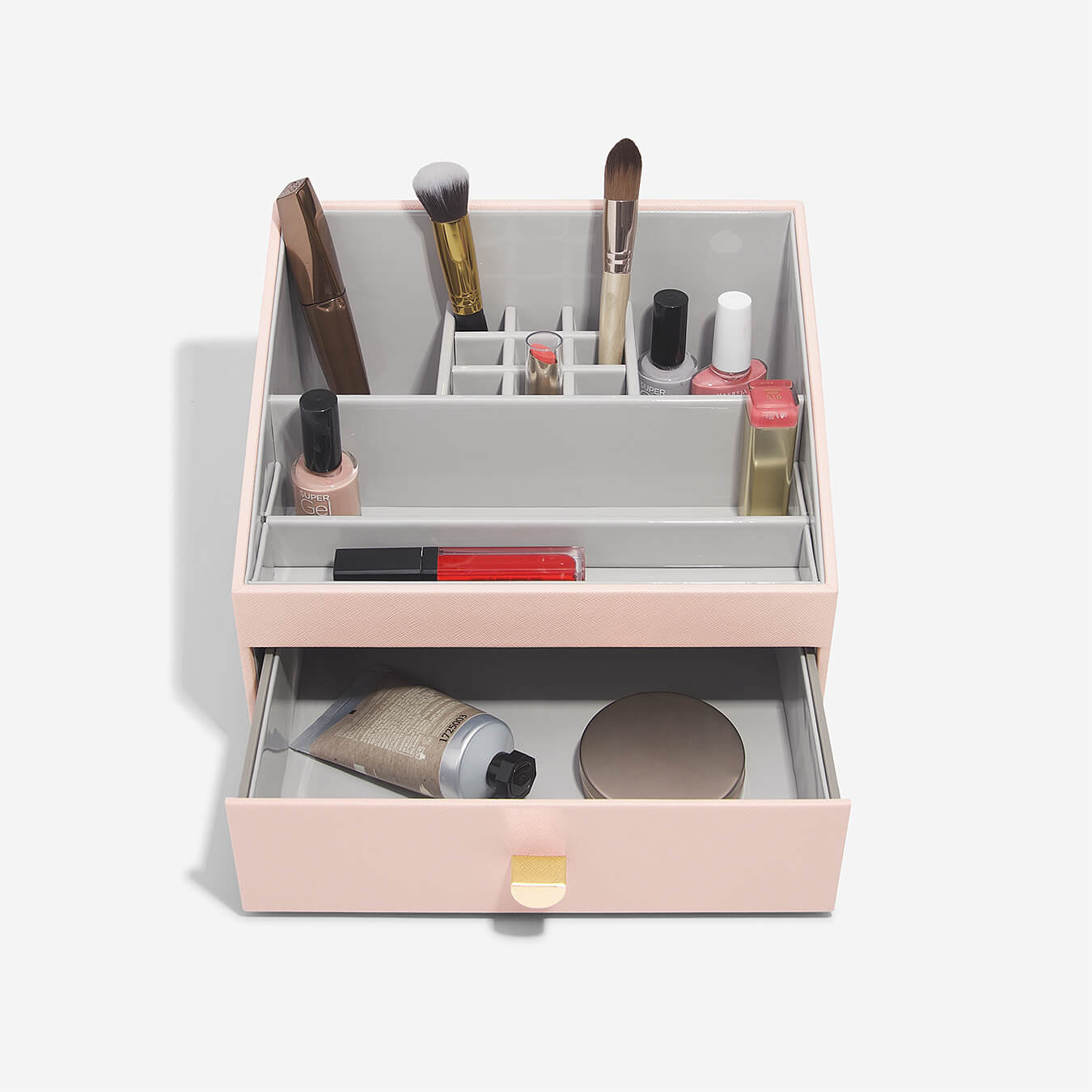 Introducing the Stackers Makeup Organiser, featuring an open caddy on top with multiple compartments to hold all your everyday makeup from brushes to foundation to lipsticks. There is also a pull-out drawer ideal for your larger palettes and makeup items.