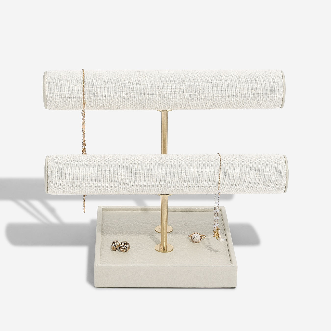 The Bangle Display Stand offers two tiers of bangle bars to safely store your precious bracelets. Finished in our luxurious linen with a faux-leather base and brush gold hardware.
